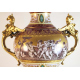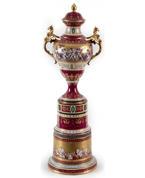 Vaso monumentale su piedistallo cilindrico in porcellana a fondo rosso magenta, decorazioni in oro a serti vegetali, fasce dipinte con scene di putti, anse a grifoni alati, marcato sul fondo in blu Royal Vienna. Austria, sec. XIX. Alt. cm104