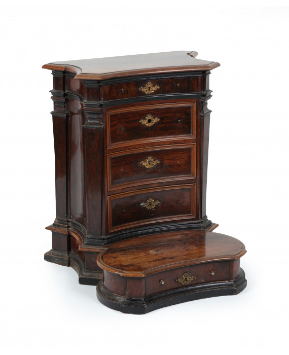 Antico inginocchiatoio a balestra lastronato in legno di palissandro, cinque cassetti, cornici ebanizzate. cm80x69x60