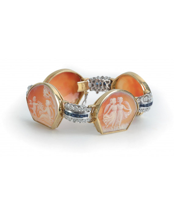 Bracciale in oro bianco giallo e bianco 18Kt con diamanti taglio brillante di circa 0,80 carati, zaffiri taglio baguette di circa 1,60 carati e quattro cammei in conchiglia lavorati con gentildonne e amorini. Peso tot. gr. 44,6. Allegata dichiarazione di autenticità a cura della gioielleria Ci&Ci