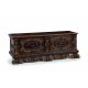 Importante e rara cassapanca in legno di noce, fronte interamente intagliato ad altorilievo e parzialmente dorato con due scene tratte dalle gesta di Perseo e Pegaso, intervallate da due telamoni laterali ed una cariatide con stemma araldico centrale, fascia inferiore con serti di frutta, volute e teste di satiro. Toscana, sec. XVI. cm64x177x60 (cerniere sostituite e serratura mancante)